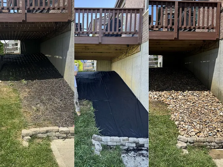 Thorough yard cleanup, brush removal, pest control, and weed mat installation.